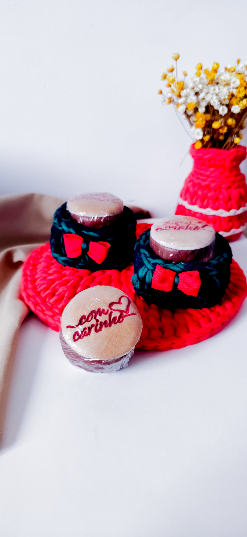 Pão de mel recheado com doce de leite. Embalado em uma cestinha de crochê linda, perfeito para presentear! Obs: a cestinha pode ser escolhido a cor e os pães de mel pode ser personalizados no topo.