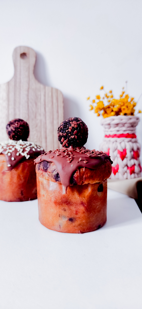 Mini chocotone recheados Decoração básica No pode pode ser trocado o brigadeiro por uma personalização em pasta americana.